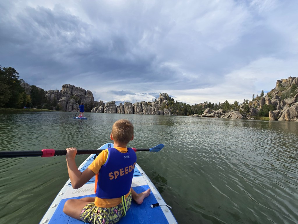 We got to see a LOT of bison and learn all about them at the Bison Center. Kai and Reya got a kick out of seeing the fake bison chips (they were squishy, plastic forms that lifted to reveal how the bison poop helps the ecosystem). We also saw donkeys, which came right up to the truck window for Dustin and Reya to pet (Kai and I were on the wrong side of the truck). Prairie dogs and pronghorns were also spotted several times during our adventures. Later in the week, we were able to paddleboard at Sylvan Lake. This was so beautiful! It was one of those moments where we were reminding ourselves how LUCKY we are that we get to enjoy this lifestyle.