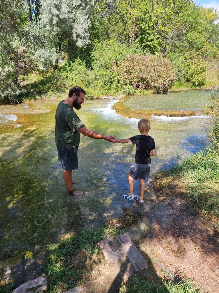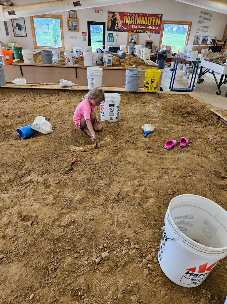 Perhaps our favorite activity of the week was visiting the Mammoth Site in Hot Springs, SD. We had stopped at Cascade Falls, a beautiful waterfall on the way (where Kai fell on his booty in the water, of course!) and marveled at how clear the water was. Kai’s shorts dried pretty quickly, so we continued on. At the Mammoth Site, we walked around the main exhibit and got to see the different layers of excavation and the fossils that were found. It’s pretty cool to see how you can learn from where the fossils are located. Basically, though, all the mammoths went to a hot spring, slipped on the edge, fell in, and drowned. Oh, and they were all male! Our dig guide said it’s been theorized that most of the mammoths fell in during their first winter away from their herd, so they were looking for easy water in the snow. While walking around the excavated area, Dustin was telling Kai how amazing the site is. Kai thought for a moment and said, “yeah… but not for the mammoths!”