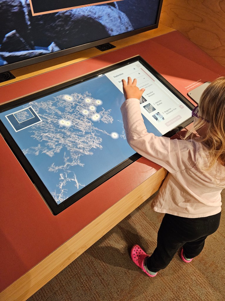 The next activity we were fortunate to do was a tour of the Wind Cave at Wind Cave National Park. Dustin woke up early in the morning to drive the 40 minutes to the visitor center to wait in line to be able to get us tickets for the day, since they were sold out online. He was successful (thanks for your early morning, daddy!) and we were able to spend some time exploring the visitor center before our tour. They have some really cool displays that show the areas of the cave that have been mapped out already, including where in the cave certain geological formations are found, where there’s designated camping locations for cave explorers (no, thanks), and where the exit points are. Reya and I had fun virtually exploring!