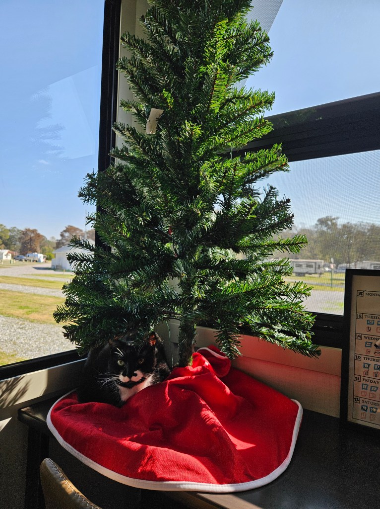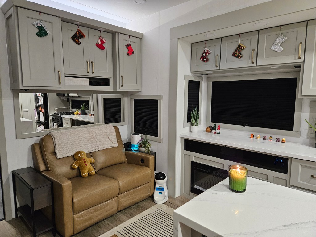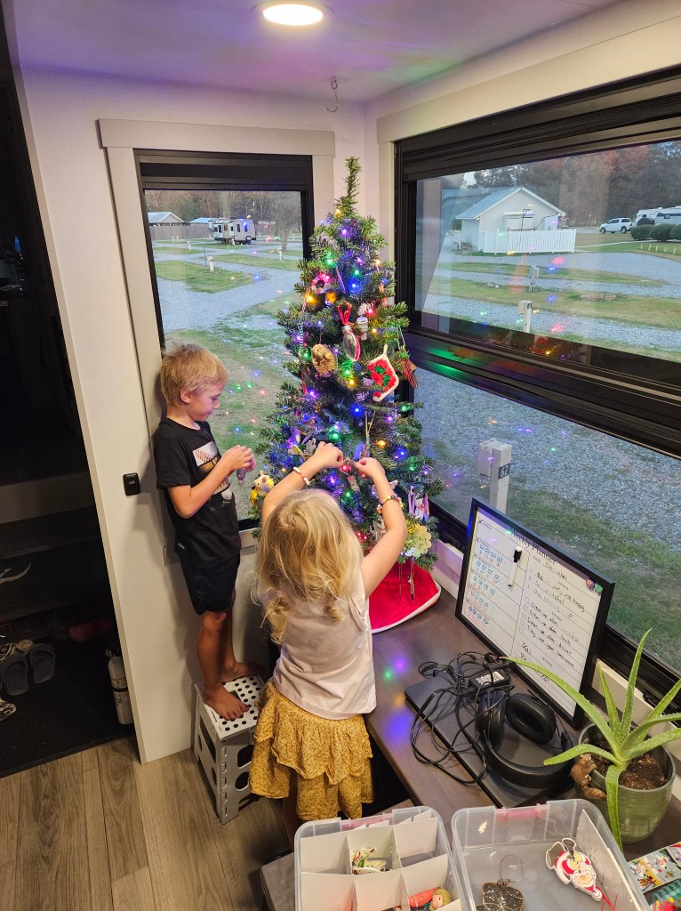 Have you ever wondered how we bring Christmas spirit to an RV? This is how! We bought a new Christmas tree this year (we didn’t think our 12′ tree would fit) and set it up on our dinesk. You can see as soon as we set it up, Socks crawled under! Then we brought a small box of our Christmas ornaments with us from our larger selection to bring our nostalgia with us. We even brought Dustin’s Mario Star for our tree topper. We put some Christmas music on and hung the ornaments as a family. Then we hung little stockings on our cabinets and put out our stuffed gingerbread man (Gingy, as Kai calls him).