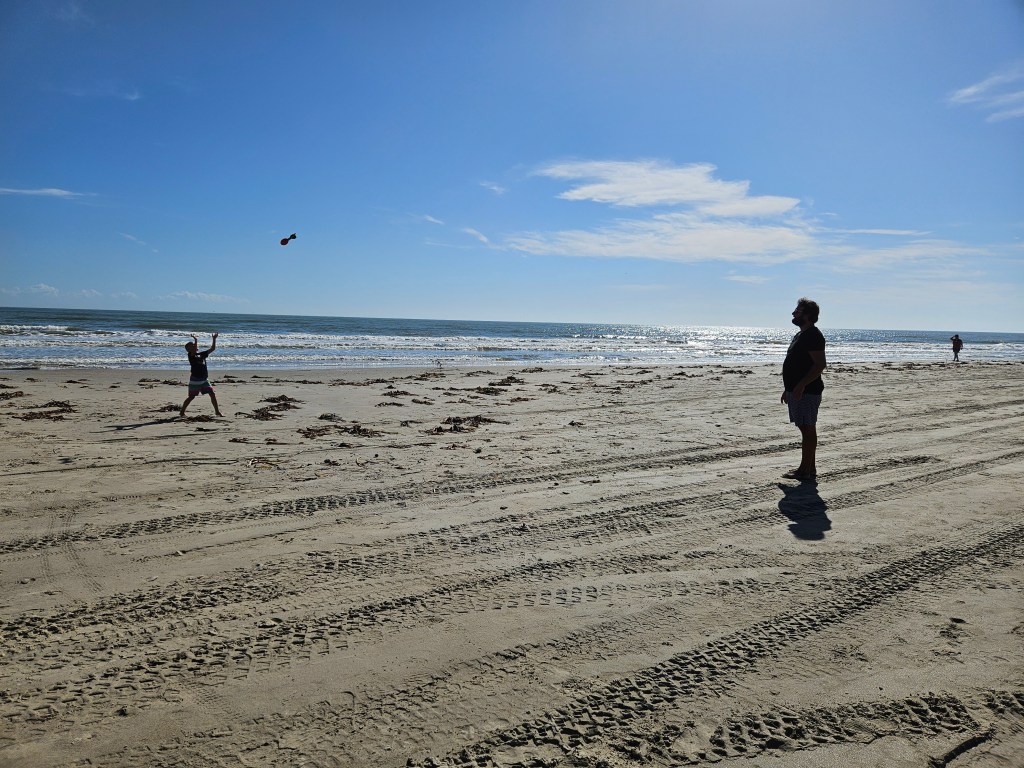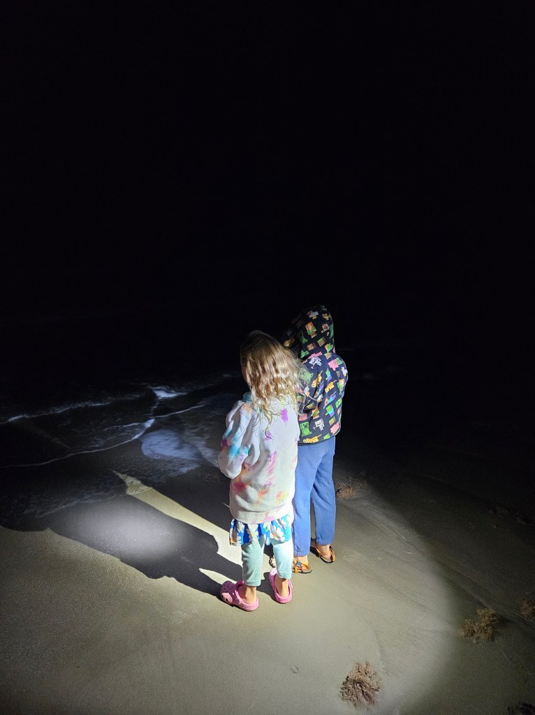 We also spent some time at the beach (how could we not?). The sand was really nice, and we discovered the quicksand aspects of the sand near the shore. The more you stood in one spot, especially if you moved your feet a little, the more you’d sink in. Pa and Kai had fun getting to their ankles and then pulling themselves back out. Beach toys were used for fun play in the sand. Kai got a new NERF Vortex football that he had fun throwing back and forth with Dustin. We also did a nighttime walk on the beach as a family. It was fun for us adults, though Kai and Reya were freaked out by dead crabs and a dead bird (yikes).