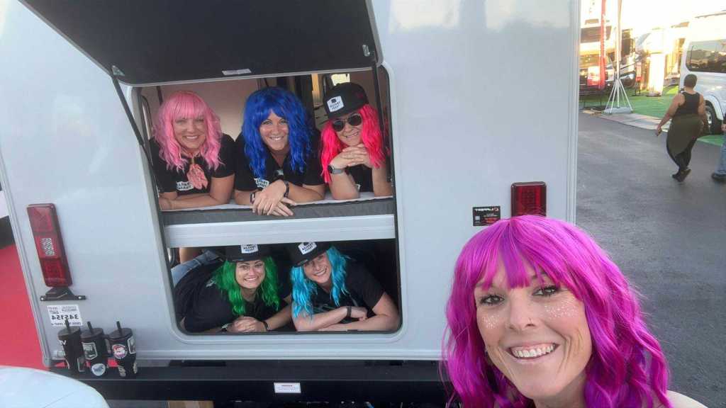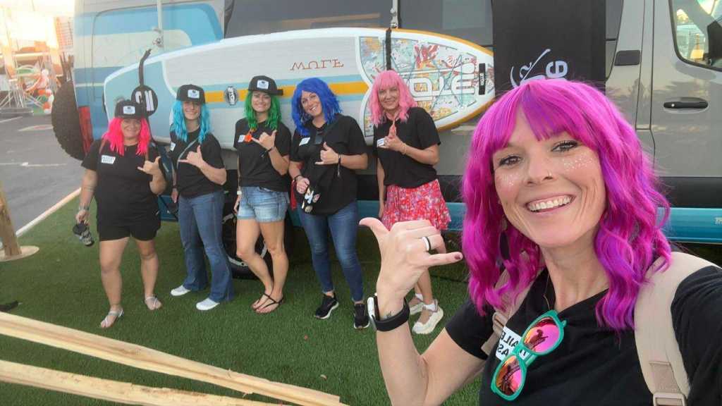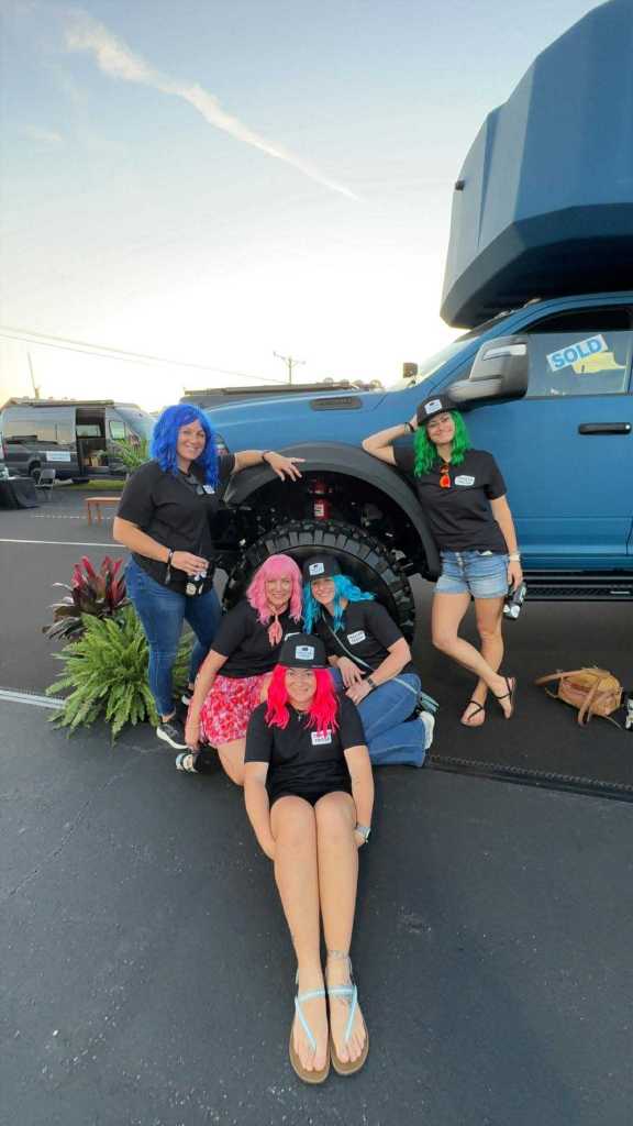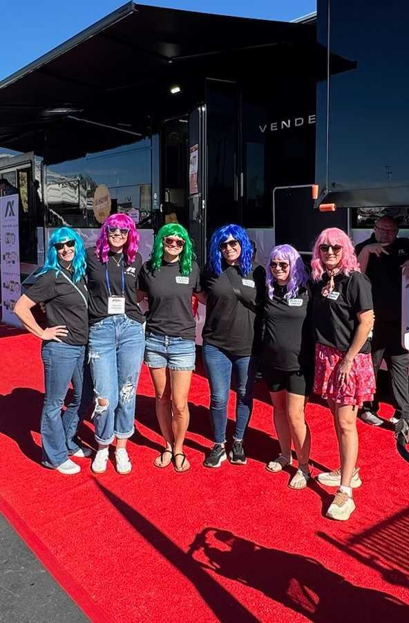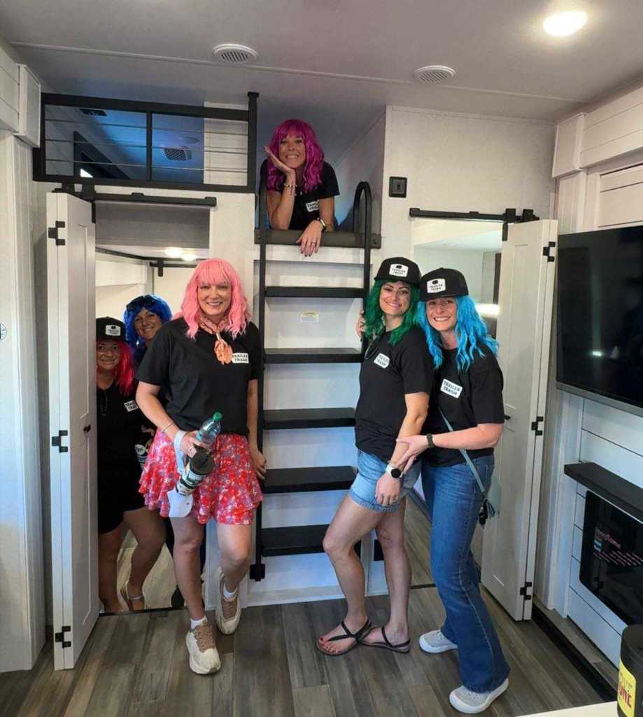 Day two of the RV show we had a bit more fun. Thanks to Amazon, we got matching wigs in different colors because, why not?? We went on a bit of a photo scavenger hunt, beginning at the Axiom booth, of course, since we were there to help support our girl. The amount of people that stopped us to take pictures with us, ask if we were in a band, or compliment us was crazy! I’ve never been so popular and it was definitely surreal. We walked through the second vendor tent and had brands pulling us into their booths because they thought we were all big social media influencers (some are, most of us are not). We were gifted exclusive Trailer Trash t-shirts from a content-creator event that we wore for the day. When we stopped by their booth (Unique Camping & Marine), we were also given free Trailer Trash hats for all of our husbands back home. Overall it was a wonderful day, culminating in games and reel creation back at the rental house. We’ve decided this will definitely be an annual girls trip!