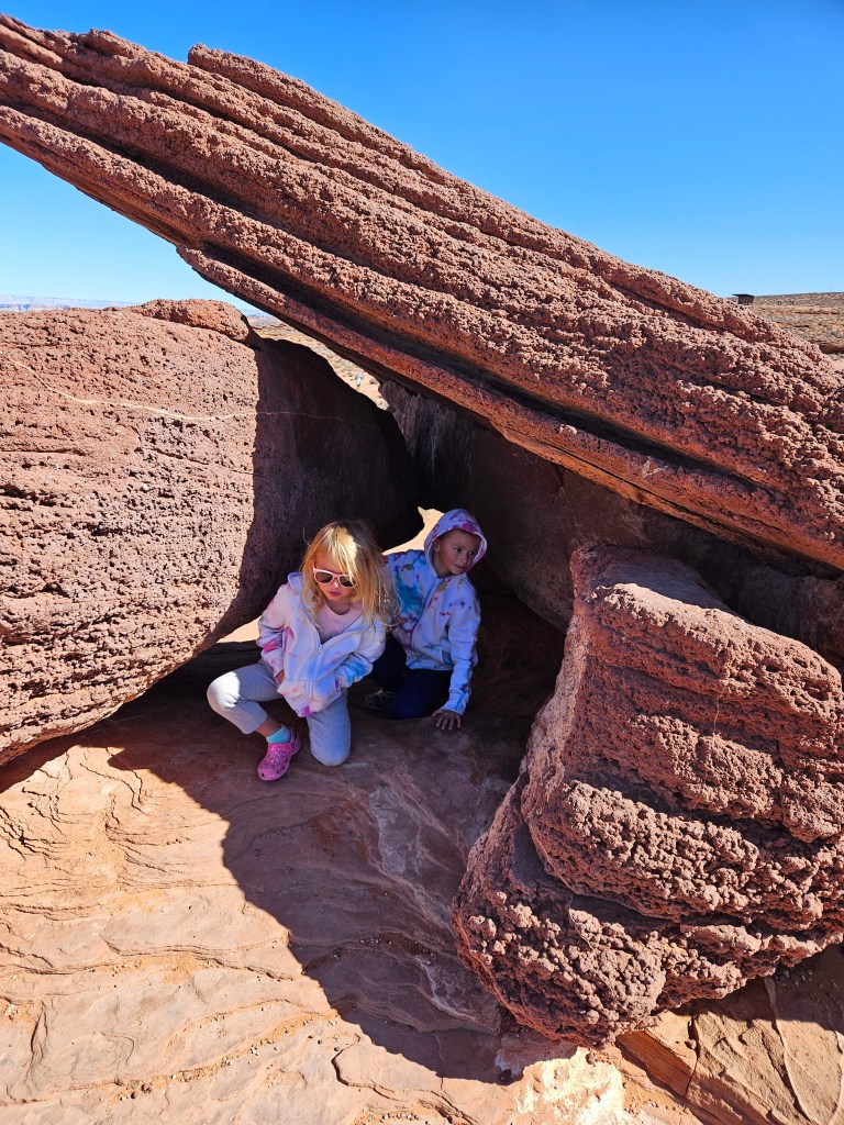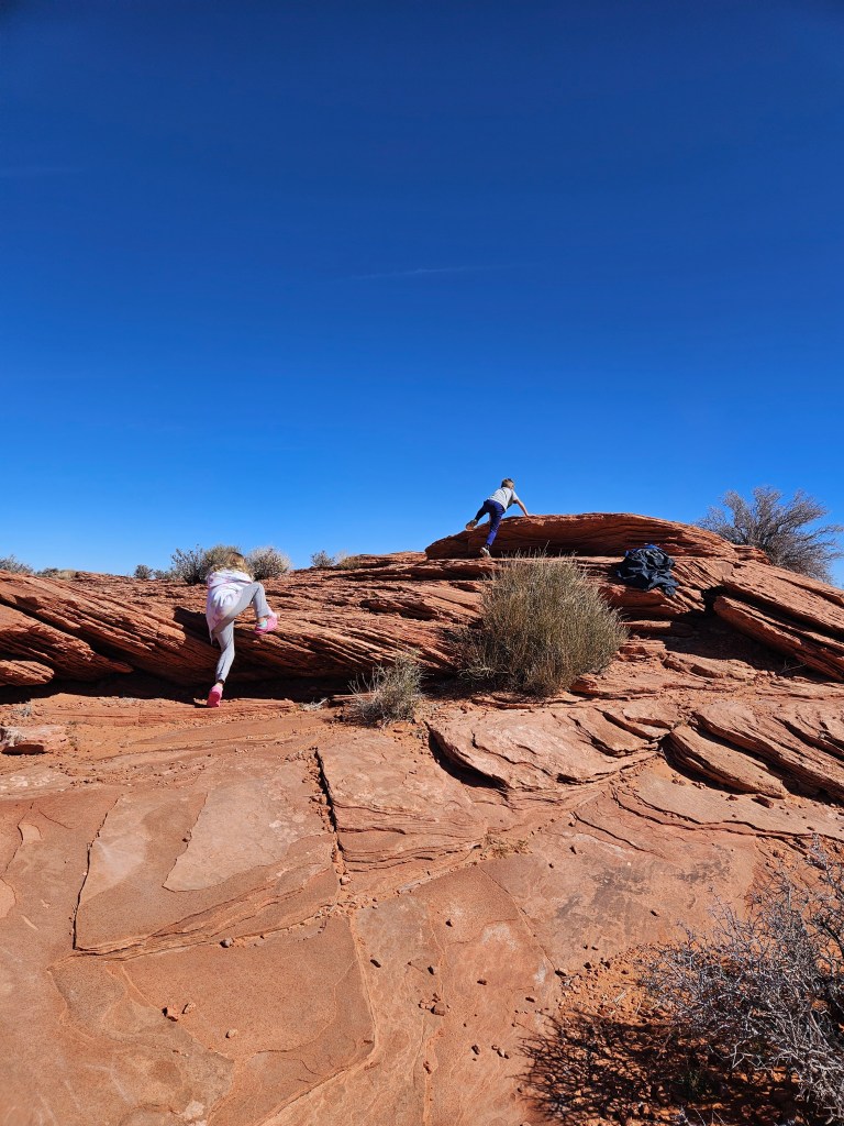 We splurged for a day trip to Page, AZ with our friends (us plus five other families). It was approximately a three hour drive, so we decided to spend the night in the hotel to avoid burnout for the kids. This was SO much fun! Our first stop was at Horseshoe Bend. The kids all had so much fun climbing on the rocks and going up the steep formations. Reya was brave when she started climbing the smaller rocks on her own. Of course all of us adults wouldn’t let the kids near the edge unless they were holding an adult’s hand. It was a steep, sheer cliff!
