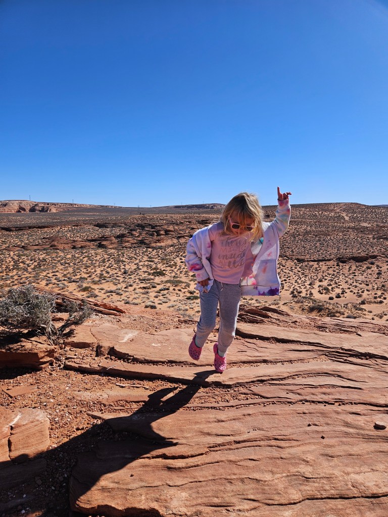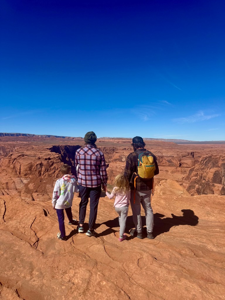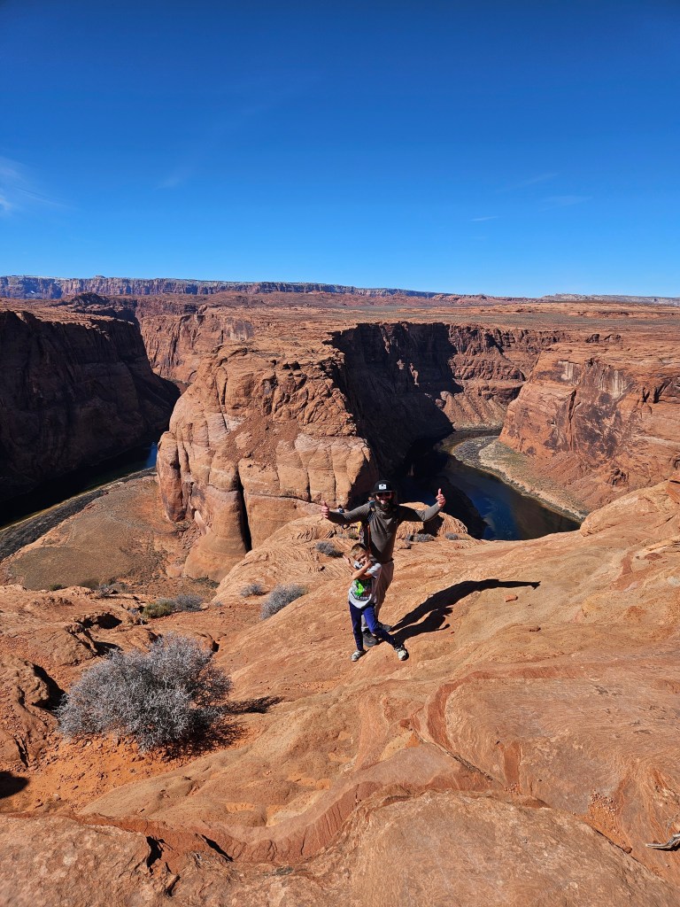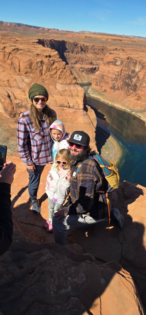 We were able to get some pretty cool family photos in front of the bend courtesy of our friends. Dustin and Kai hiked further down towards the edge and had a blast. Kai is quite the little daredevil. He’s not afraid, though he’s mastered the spider walk when going down steeper inclines, which calms my heart a bit! The one negative about this stop? I lost my chapstick out of my pocket. I swear I didn’t want to litter, I even searched the whole trail back for it but it was just gone. Despite the loss of my emotional support chapstick, this was a fantastic stop!