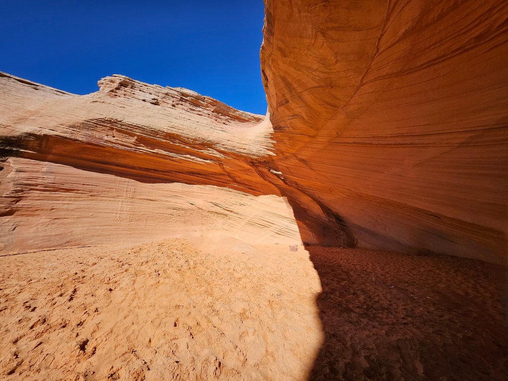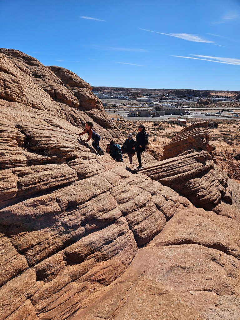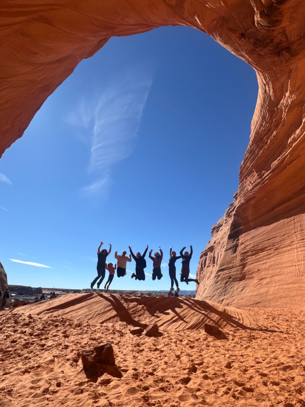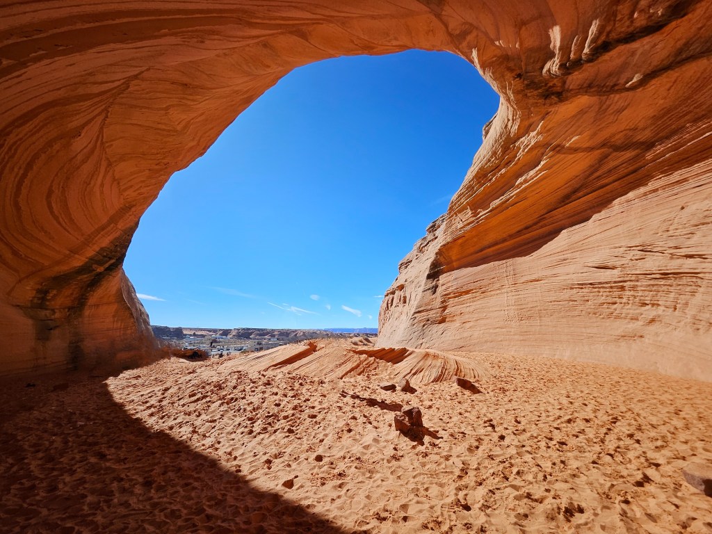 Our second stop on our journey to Page, AZ was the Shell gas station. Yes, a gas station. They had a lovely parking lot where we could park all of our massive dually trucks and enjoy a quick picnic lunch. Once we finished our lunch (pb & j sammies with chips for our family), we were more interested in what lay behind us than the gas station in front of us. After hiking for about two minutes we came across The Big Lake Sand Cave, also called Biidi the Arch, or Shell Cave. This was BEAUTIFUL and crazy to think it’s right behind the gas station! The sand is a rich rust color and the sky when we went was a vibrant blue, making the photo opportunities perfect.