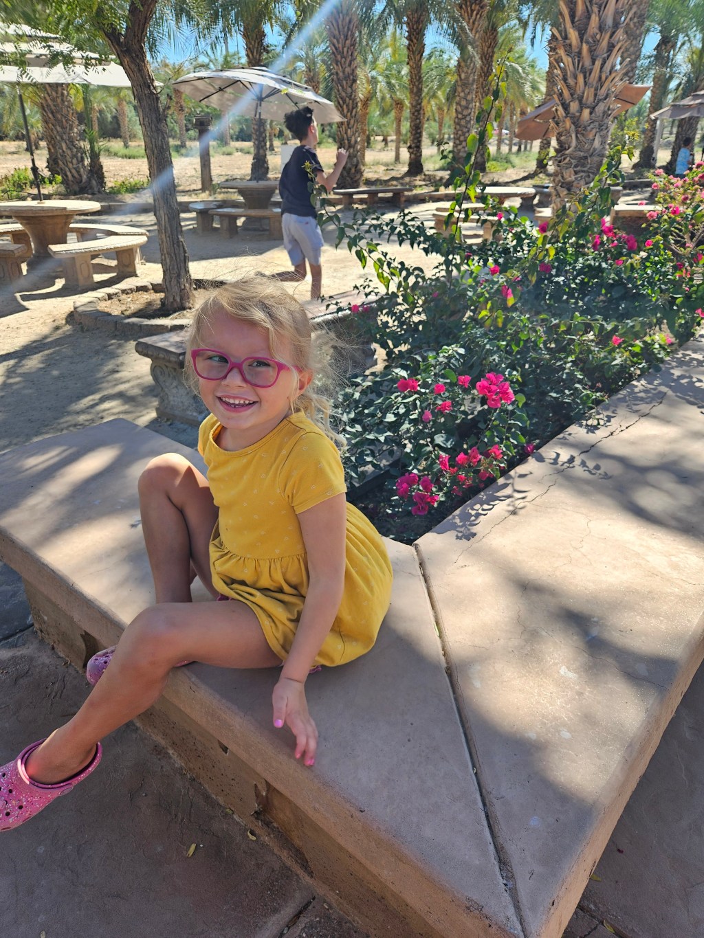 While we were in Winterhaven we realized we were near the Center of the World. Obviously we had to stop by! Before, though, we visited a date farm. We’ve seen lots of palm trees on our travels and before visiting Palm Springs, CA (full of palm trees), we figured it would be a fun way to learn about nature. We visited Martha’s Gardens, where Reya and I were able to try some dates (dried, in a date milkshake, and in small candies) and see how they grow on the palm trees.